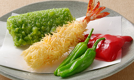 夕食❹の揚げ物は、素麺をまぶした「海 老の白糸揚げ」と、ほうれん草ペーストを入れた衣の「いかの翡翠揚げ」盛り合せでございます。野菜の素揚げも添えて、この時季らしい一品になっております。