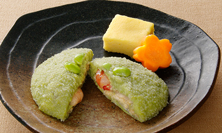 夕食❹の蒸し物は、 枝豆と里芋のすりつぶしを饅頭状に丸め、中に穴子と海老を埋め込み、蒸し上げました。緑鮮やかな色合いとやさしい味わいをお楽しみください。慈姑の入った蒸し物もやわらかく、上品な甘さです。