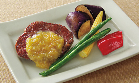 夕食❹の焼き物は、 牛ヒレ肉をやわらかさや上品な旨味を引き出す日本酒で味付けして焼き上げ、相性の良い味噌で田楽風に仕立てました。季節の野菜を添えてあります。