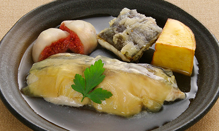 食❹の蒸し物は、 鰆を価値ある白板昆布と共にやさしく蒸し上げました。大根のおろしだれでご賞味ください。いちじくの甘酢八方煮やさつま芋の素揚げ、酒粕を竜皮昆布で挟んだ揚げ物も絶品です。★博多揚げには酒粕をそのまま使用しているため、アルコールが残っている可能性があります。★