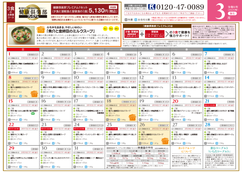 『健康倶楽部プレミアム』は、夕食・翌朝食・翌昼食の3食コースです。