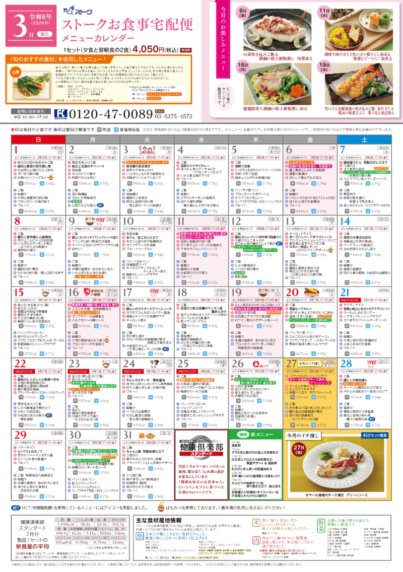 毎日日替わりで7,000種類ものメニューから組み合わせた献立は、2食合計でカロリーは1,100kcal前後、塩分は5,5g未満で設計しています。