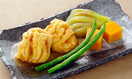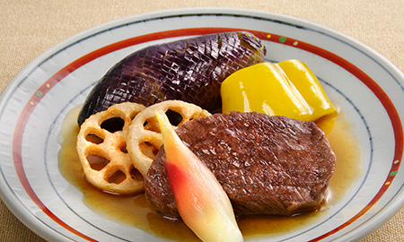 夕食❹の煮物は、焼酎で下味をつけたハーブ豚ヒレを素焼きし、トマトを入れた白味噌風味の煮汁で炊き上げました。車麩の含め煮や夏野菜も、かけ汁でお楽しみください。