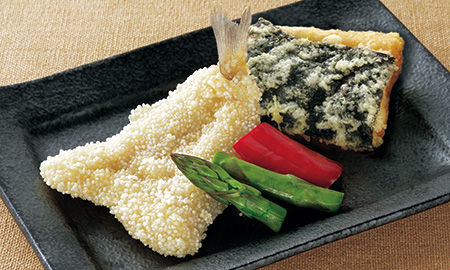 夕食❹の揚げ物は、旬を迎えた太刀魚を焼き海苔と共に揚げたものと、しんびき粉をつけて揚げたきす、2種の野菜を盛り合せてみました。