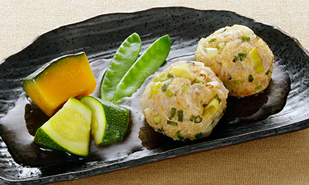 夕食❹の煮物は、合鴨と鶏の合挽肉にごぼうや葱を入れた、野趣溢れる肉団子に調理いたしました。旨味たっぷりの肉汁で、旬の野菜もやさしく炊き上げました。