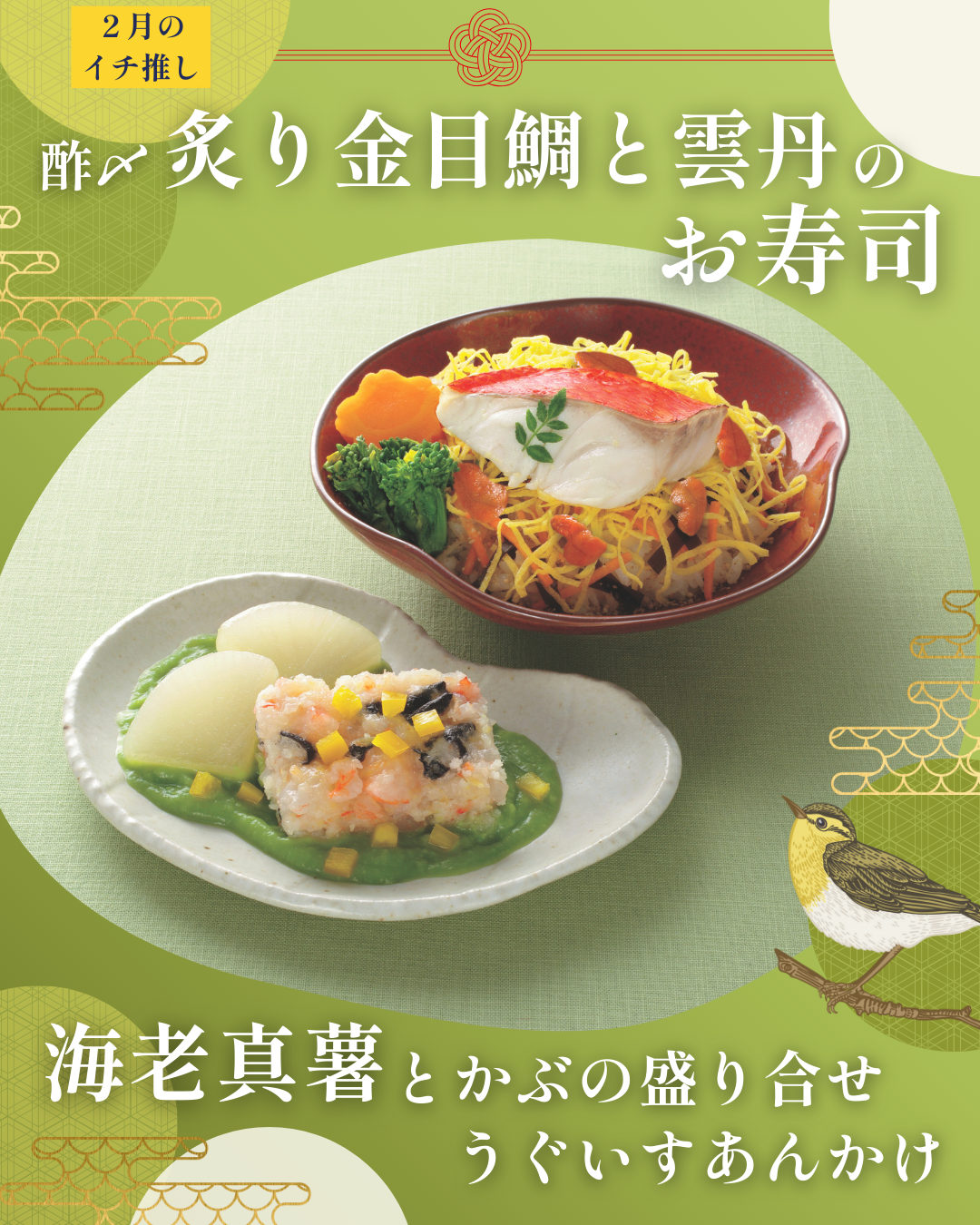 この季節にぴったりの手作り海老真薯とかぶの盛り合せには、春の訪れに先駆けて、うぐいすあんをかけています。