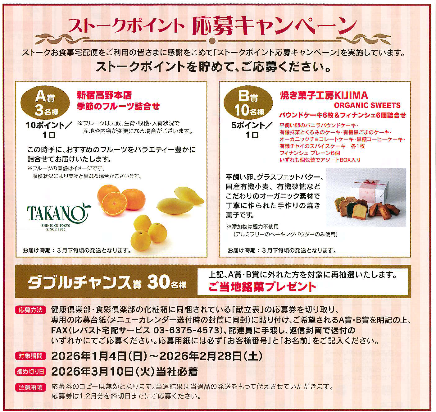 【2026年1月・2月】ストークポイント 応募キャンペーン2025年12月9日 アップグレード賞品獲得のチャンス! ※応募台紙についてはメニューカレンダー送付時に同封しております。 また、紛失した場合は手配いたしますのでフリーコールまでご連絡ください。 こちらの内容につきましては、メニューカレンダーの裏面の右下に表記しております。 トピックス, ストークポイント応募キャンペーン, newsストークポイントキャンペーン